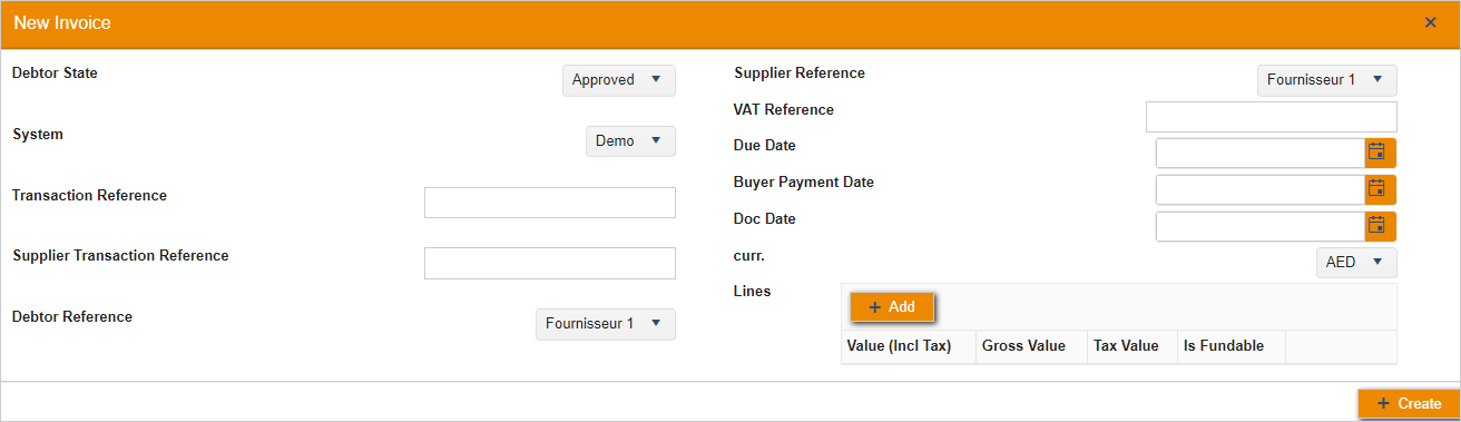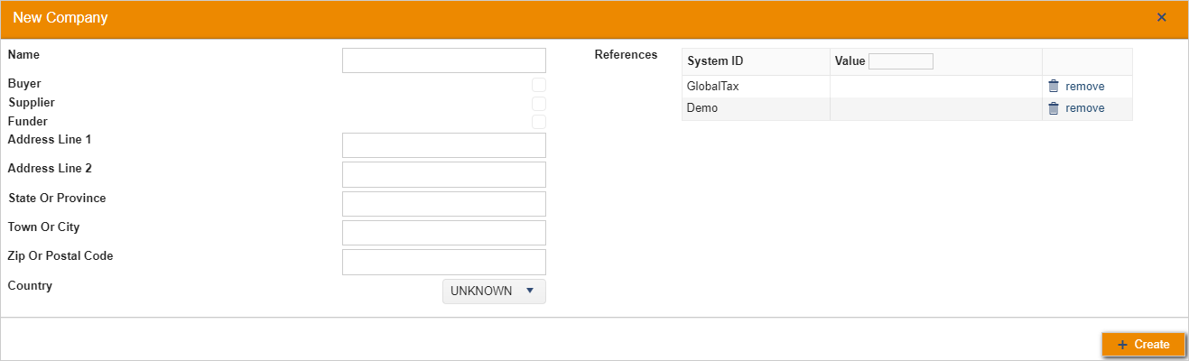 “Name” here is the name of the company you wish to import. You must select one of either “Buyer”, “Supplier” or “Funder” with the checkboxes. It’s important to note here that the address fields are also required so you must fill them in. “Global Tax” is the company’s Global Tax Reference and then the “Demo” reference is your specific reference to that company. On clicking create once all the required fields are populated, the company will then be created in the system and will be visible in the UI.