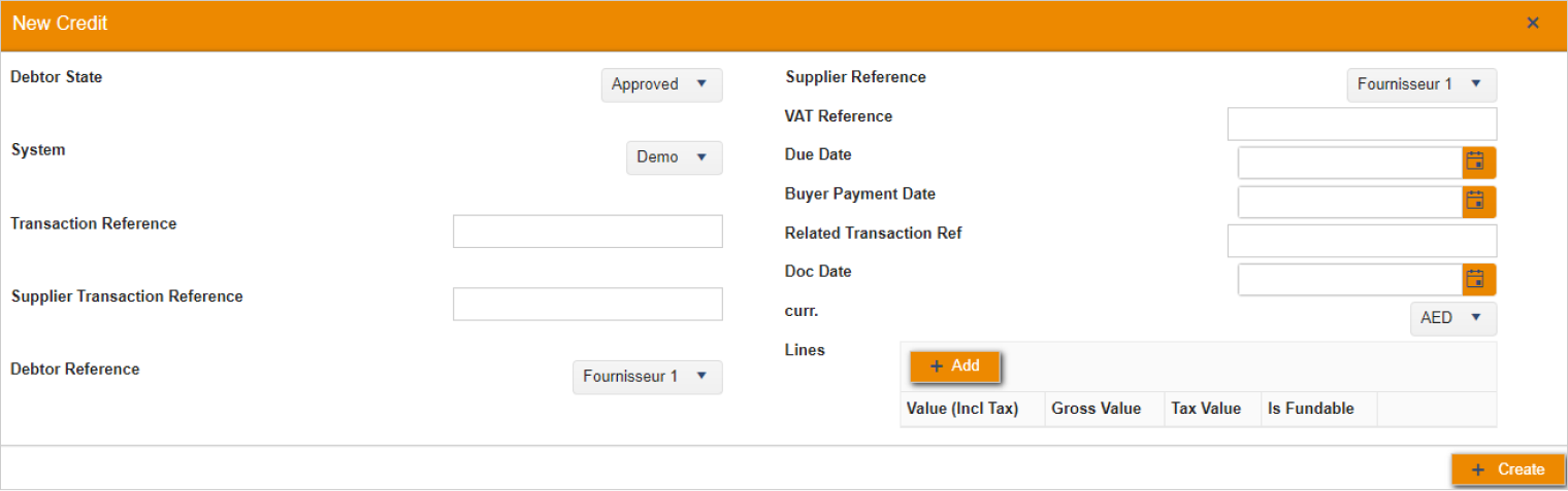 As you can see, this dialog is incredibly similar to the one used to import invoices. It just includes one extra field, “Related Transaction Ref” this is the field that is used to relate a credit to an invoice that’s already in the system. This field is not required as you can have Credits that are not related to invoices, but in the case you do need to relate it to one you will need its transaction reference to put into this box. On filling in the fields and clicking the create button in this dialog, the system will create your credit and it will be visible in the UI.