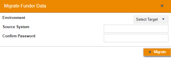 “Environment” is the environment you wish to migrate the existing funder data to, e.g. Dev or Staging. “Source System” is the source system you wish to take the funding data from and “Confirm Password” is prompting you to enter your password. This functionality is only usable if you are a bucket admin in the system you want to take the data from and the system you want to import data into.