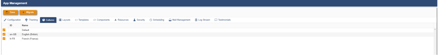 You Access this page through the App Management Tabs. From here you can manage what Cultures (languages) you wish to support in your App.