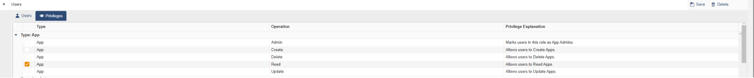 Within this expanded view, you can manage what users are in each role and remove them from the roles if necessary. You will also see that there is a Privileges tab in this expanded view, this is a way to control each of the roles and what actions they can carry out. As an example (see the following screenshot), users are only able to “read” (view) apps and are unable to create, update and delete them as those are tasks that can only be carried out by admins in this case.