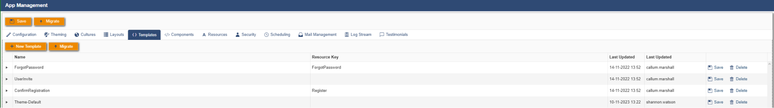 This grid contains any relevant templates for the given app, the most commonly used one across all portals is the Theme-Default, which can be customised to ensure that our theming matches the client’s requested theme.