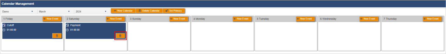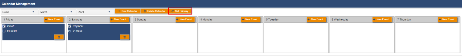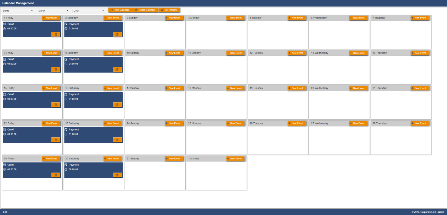 Within this UI, you have the ability to control when cut-off events will happen and set the dates of any payment runs. The calendar event entries display what date they will occur and the time of their occurrence.