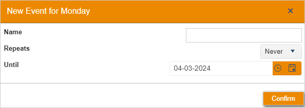 The “Name” should be populated with something that’s relevant to the event you’re creating, if you’re creating a cut-off event then it should be called “Cutoff” and if you’re creating a payment event, then it should be called “Payment”. “Repeats” and “Until” is how you set how frequently you want these events to occur and to what date you want them to repeat. This removes the requirement to manually create events that you want to happen weekly for example. If you want the Cutoff event to occur every Monday until 03-06-2024, you can set the drop down to “Weekly”, when the “Confirm” button is pressed, it will then create a weekly cut-off event every Monday until the 3rd of June.
